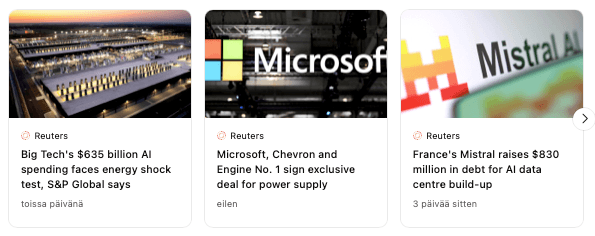 Havainto: Reutersin mukaan Big Techin AI-budjetteja painaa energiariski, ja Microsoft hakee sähköntuotantoon suoraa kumppanuutta Chevronin ja Engine No. 1:n kanssa.
